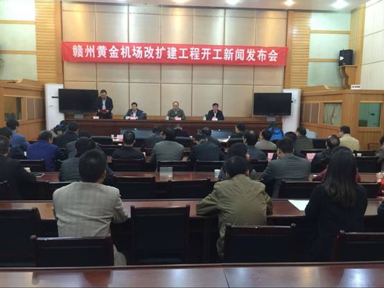 市政府召開贛州黃金機(jī)場(chǎng)改擴(kuò)建工程開工新聞發(fā)布會(huì)。圖為發(fā)布會(huì)現(xiàn)場(chǎng)。