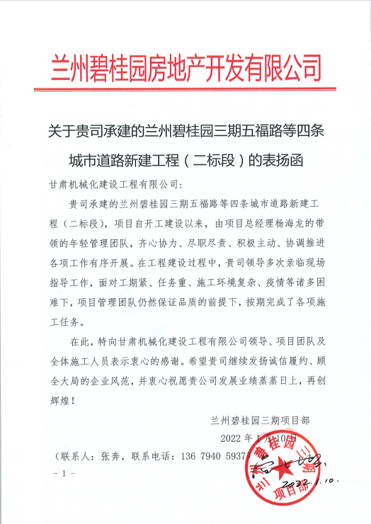 1月10日,我公司收到來自蘭州碧桂園房地產(chǎn)開發(fā)有限公司的表揚(yáng)函,函中提到,蘭州碧桂園三期五福路等四條城市道路新建工程(二標(biāo)段)項(xiàng)目自開工建設(shè)以來,項(xiàng)目人員面對(duì)工期緊、任務(wù)重、施工環(huán)境復(fù)雜、疫情等諸多困難,在保證品質(zhì)的前提下,按期完成了各項(xiàng)施工任務(wù),提出表揚(yáng)。